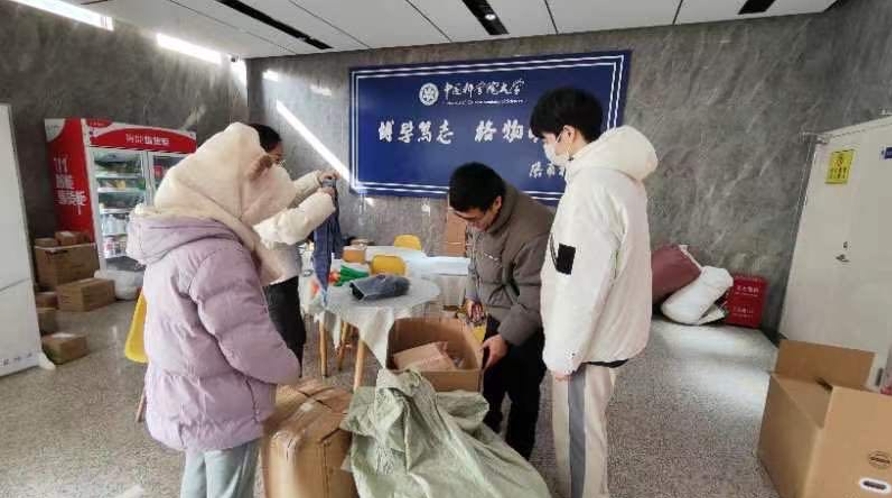 同学们将清洗干净的保暖衣物、棉被认真整理、分装,考虑到可能存在食物短缺问题,大家还自费购买了10箱自热米饭,通过中国邮政救灾捐赠物资专门寄递通道,一并寄送了给灾区。